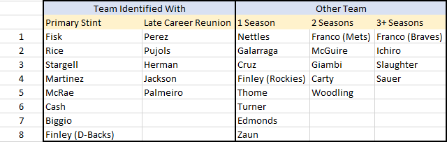 - Graig Nettles also appears on this list with the last homer of his career, a game-tying shot in the 8th inning of this 1988 game, won by the Expos in extras on a walk-off hit by Tom Foley (Foley is the most recent of 15 modern era players, including two HoFers, to begin a career with twelve consecutive 100+ PA seasons, each with OPS+ under 100). Nettles’ second-to-last homer was also as a pinch-hitter, for Atlanta the season before, when Nettles became the oldest Brave with a pinch home run (until Franco came along). The oldest Washington National with a pinch home run is 37 year-old Jayson Werth in this 2016 game.